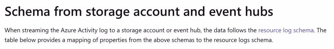 For activity logs, there is a separate set of schemas depending on the event category - except, if you’re sending events to a storage account or event hub, in which case the activity logs conform to the common top level schema for resource logs.