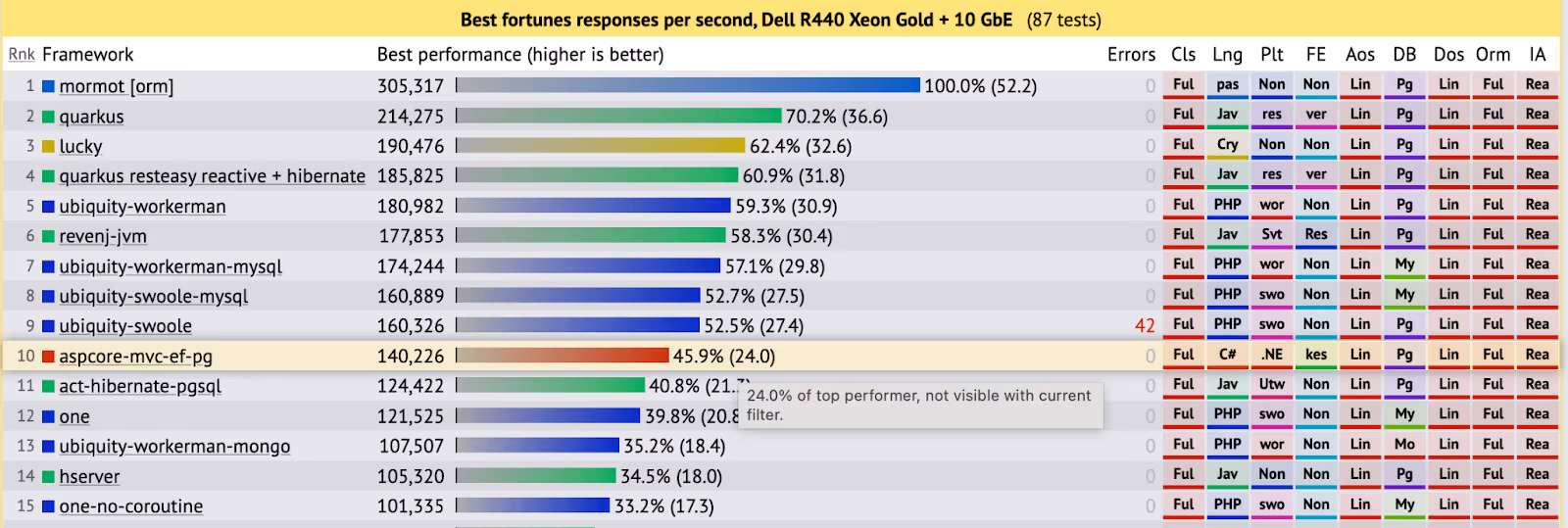 Performance is rarely the primary reason to choose a language, but it’s certainly a nice bonus. C# has been great from this perspective. Taking a look at what feels to me like the most representative TechEmpower benchmark ‘fortunes’ (using ORMs & a ‘full’ framework), you’ll find the mainstream ‘paved road’ .NET stack at 10th (out of 80). It’s probably fair to say that many of the frameworks which beat it are a little more niche and aren’t the kind of things you’d just happen to find yourself using.
