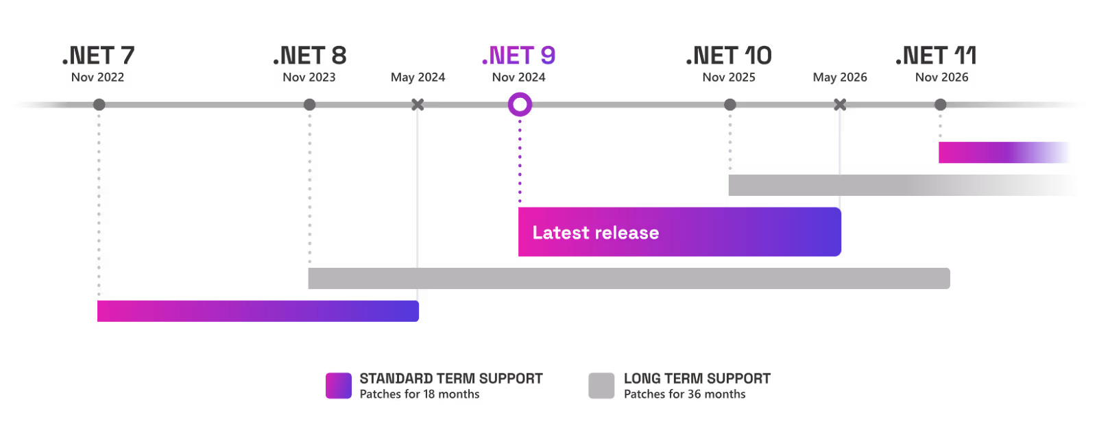 Here C# and .NET really shines. A major version is released at the same time every year, alternating between LTS (Long term support) and STS (Short term support) releases. LTS releases get three years of patches; while STS get 18 months. Changes seem to be well-documented and tested and generally backwards compatible. It’s nice that so much of the ecosystem marches to the beat of this release schedule; so you’ll find that many of your core dependencies will actually immediately benefit from new language features, data types and performance improvements, and that they’ll have been tested together.