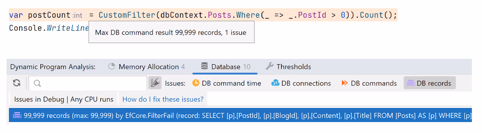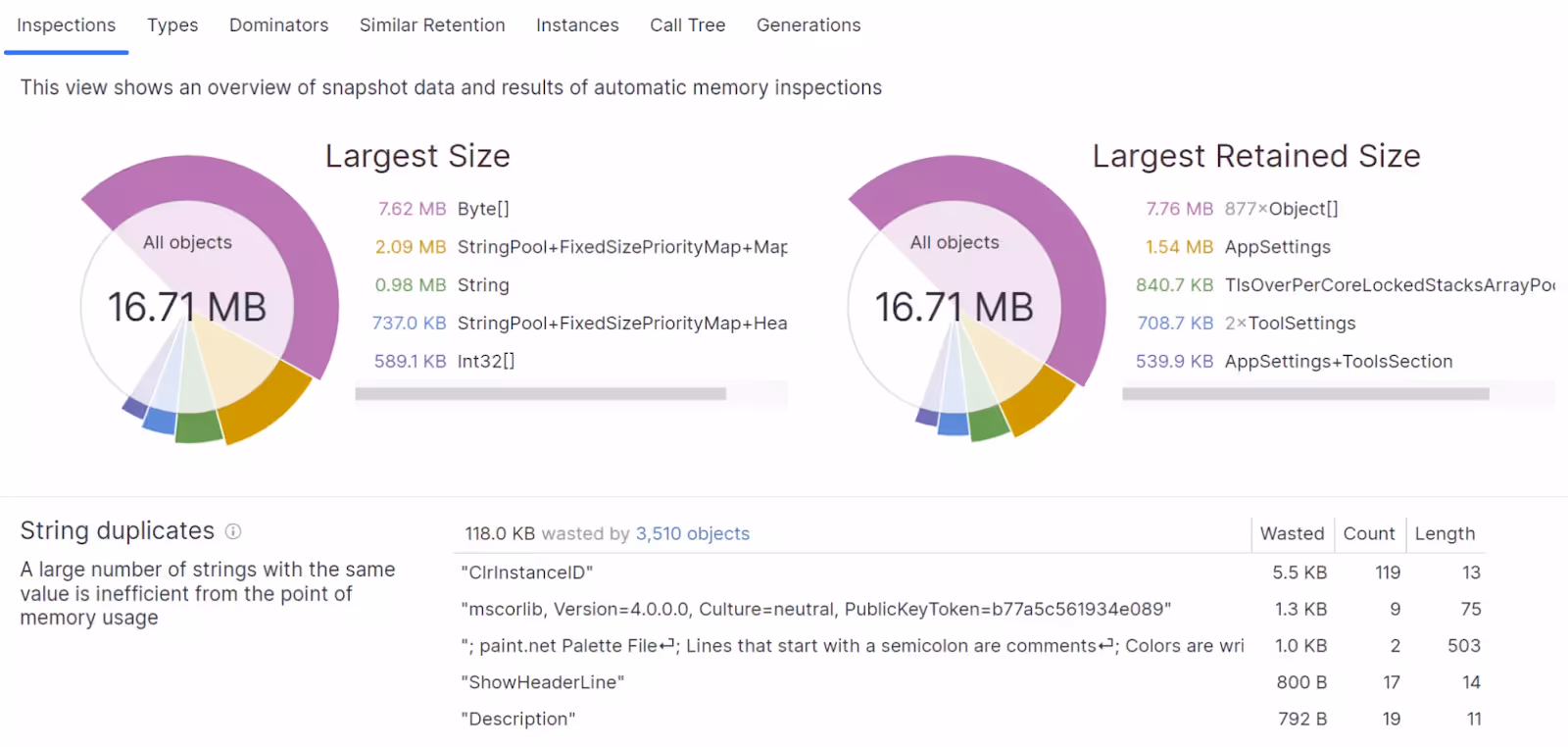 The variety and quality of tooling available is another benefit to working in such an established ecosystem. We use Rider, which is a brilliant IDE and is free for non-commercial use - I would thoroughly recommend it. It does everything you’d expect (debugging, tests, refactoring etc) and probably a lot more too - e.g. via Dynamic Program Analysis it can automatically detect things like inefficient database access patterns, excessive memory allocation issues, slow HTTP handlers. Interactive debugging is seamless and very powerful. There’s great support for runtime memory profiling, comparing snapshots, inspecting the heap, detecting leaks.